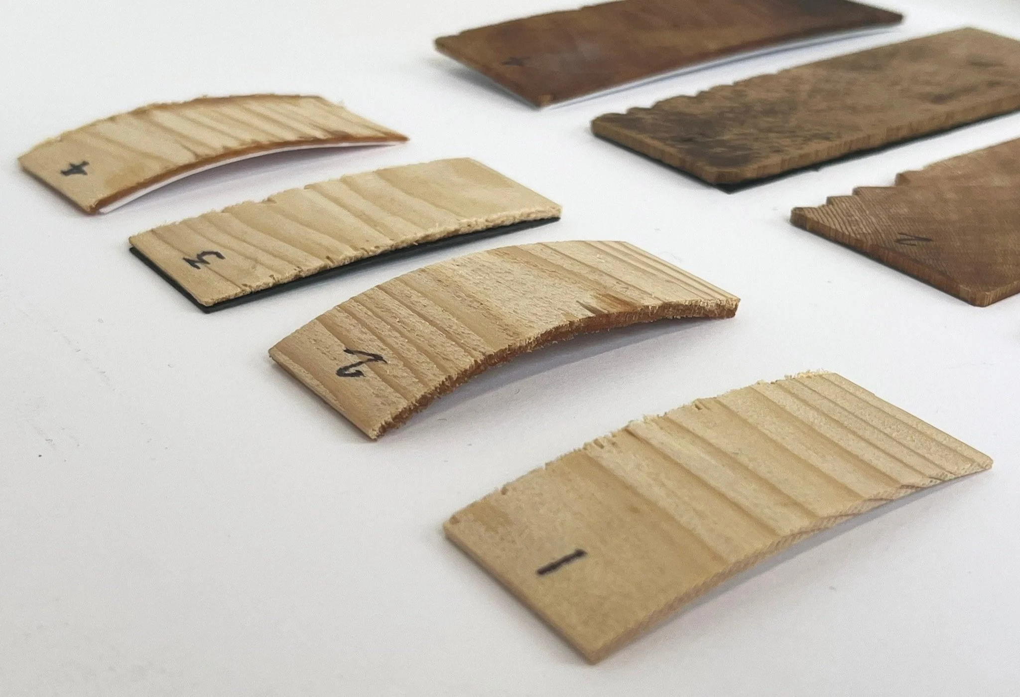 ‘Cypress + Epoxy Resin’ and ‘Wood + Polypropylene’ were successfully bent after 15-20 minutes after. Both composite materials can be used in the food container due to its food safeness and waterproofness